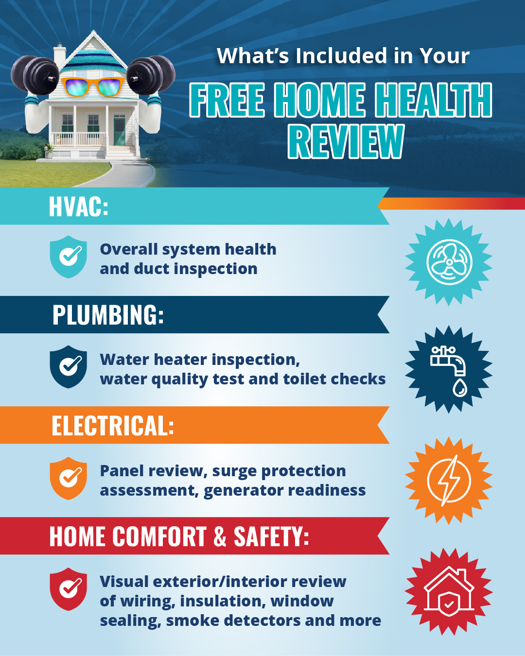 A: A multi-point checkup of your home’s key systems: HVAC, indoor air quality, plumbing, electrical, and overall efficiency.